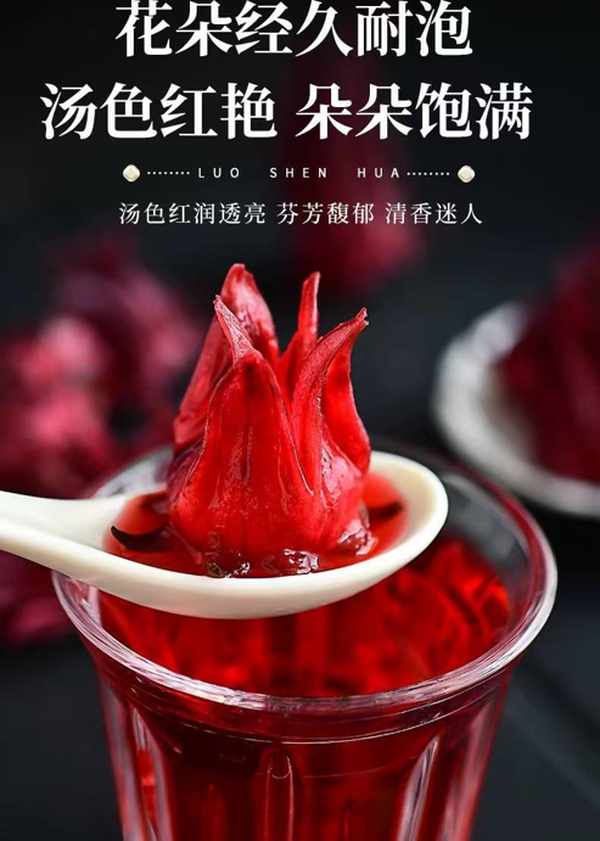 1.品名:洛神赋 2.规格:50克(28*19*11.5厘米) 3.配料:洛神花 4.功效:甘酸开胃 助消化 补血